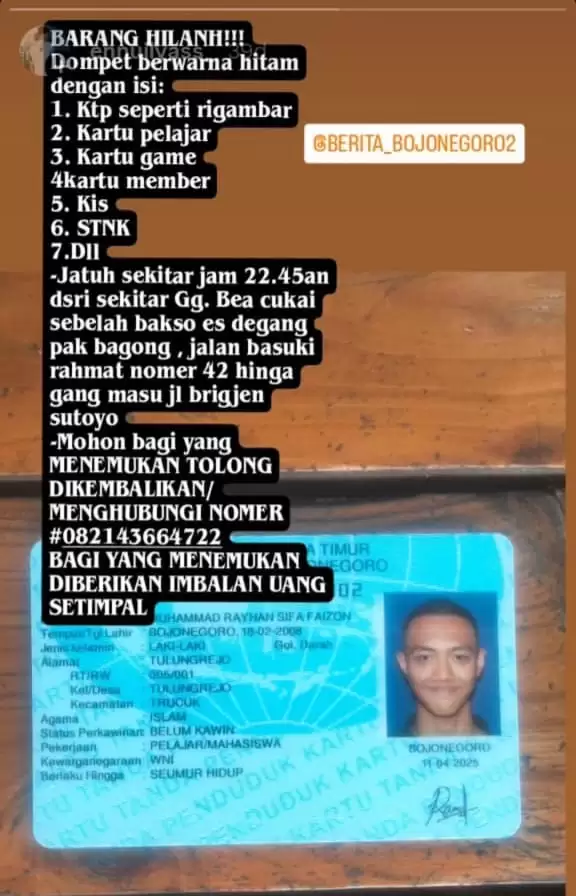 BOJONEGORO - Telah hilang sebuah dompet berwarna hitam milik Muhammad Rayhan Sifa Faizon, warga Desa Tulungrejo RT 005 RW 001, Kecamatan Trucuk, Kabupaten Bojonegoro.